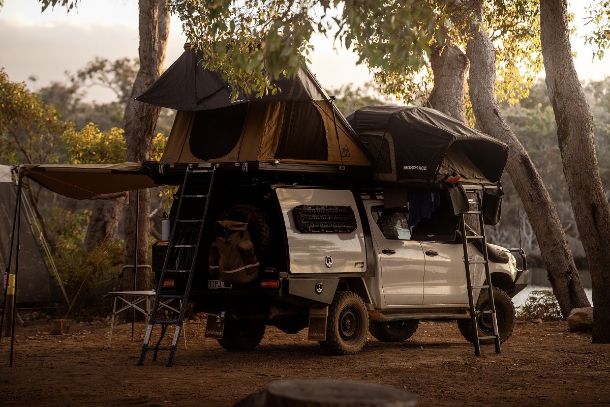 The tents have more interior space and are therefore suitable for tall people. Both tents feature LED lighting and various storage compartments. Useful extras can be provided that are not available with other 4WD campers with roof tents: Hema Maps GPS 4WD navigation for $25.00 per week, Starlink with unlimited data (price on request) and a portable toilet + camp shower in combination with a quick-set-up stand-alone shower/toilet tent (free with rental periods of 21 days or more).
