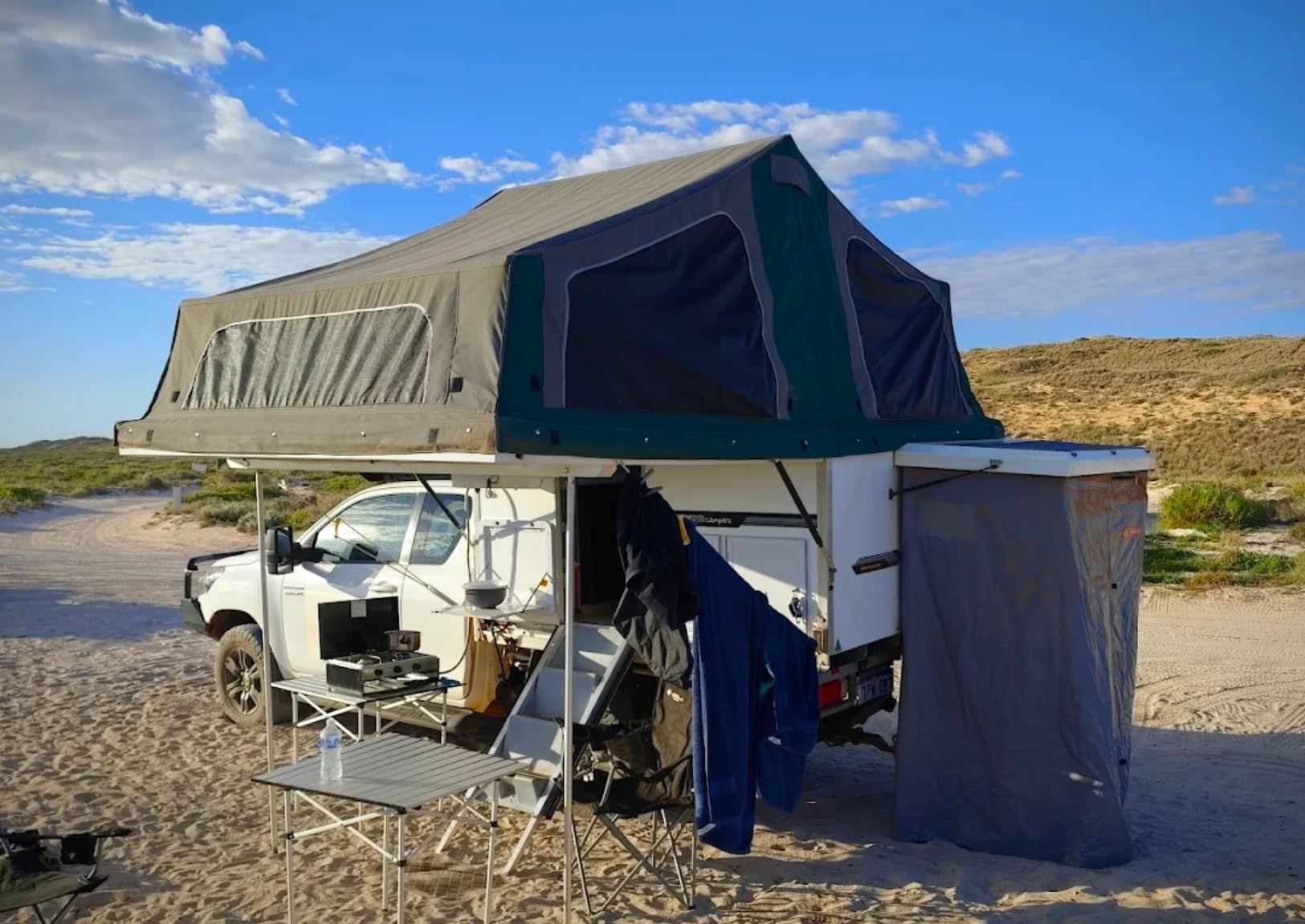 Toilet and shower: a portable toilet can be rented for an extra charge of AU$200. If you rent the camper for longer than 6 weeks, this is free. A Hilux 2 and 4 berth come standard wit an outhouse shower cubicle at the rear of the camper (see one of the pictures), it can be set up/unfolded within 2 minutes. The same for the other way round. The portable toilet has its own compartment in camper.