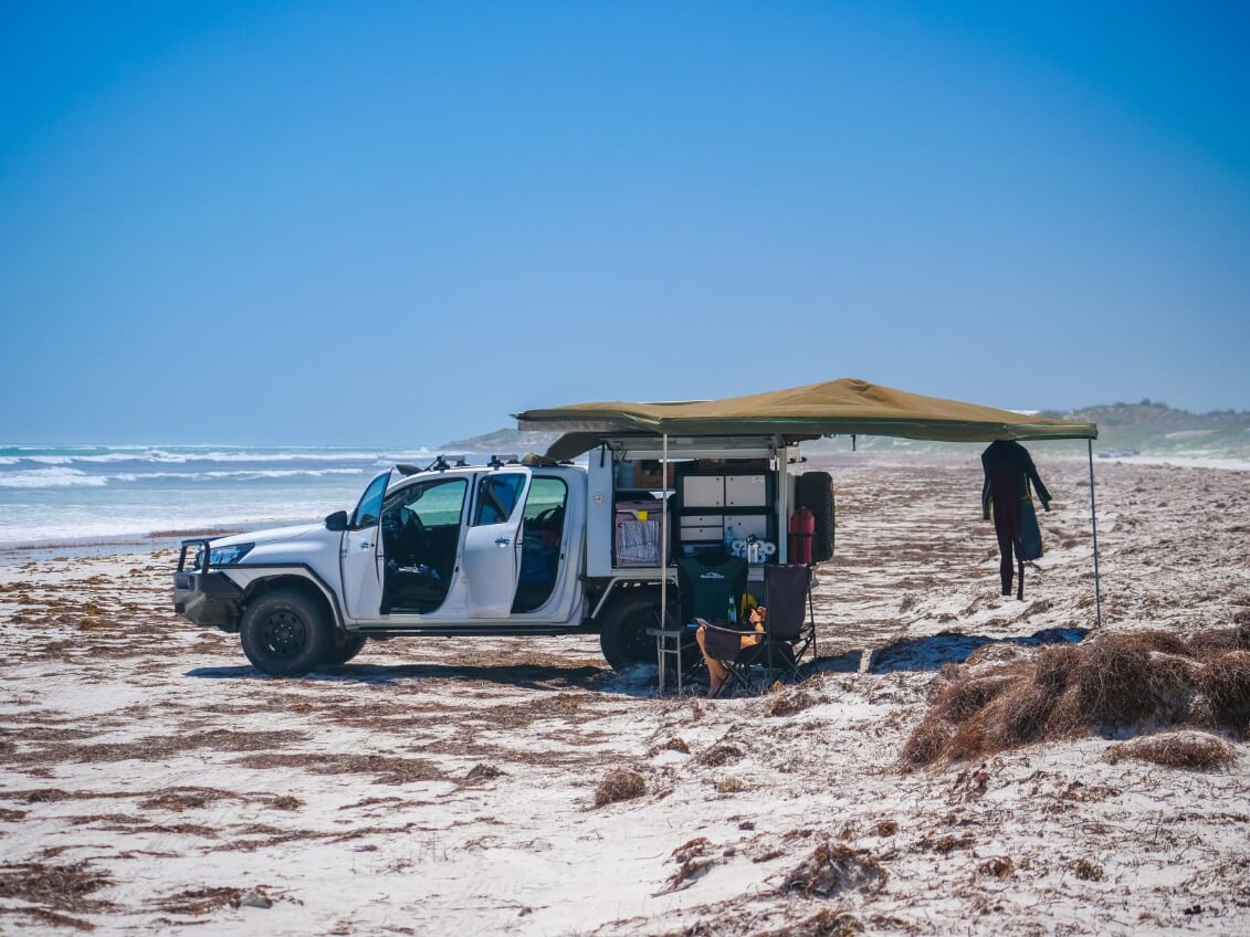 Features: Toyota Hilux, 2800cc diesel, automatic transmission, airco in drivers cab, 142 litres fuel tank, fuel consumption 12-13 litres per 100 km*, 5 seats with seat belts, reversing camera, built-in GPS navigation (only a few model 4WD campers are equipped with this), Apple Car Play, lockable canopy, two roof tents, 4 sleeping places (a ground tent can be supplied for a fifth person), built-in kitchen, power supply 12V/240V, snorkel, bullbar, dual battery, recovery kit, air compressor, 2 spare wheels, UHF radio and 270 degree awning. Good ventilation possibilities in both roof tents due to the large windows. A Hilux with roof tents is unmarked so without advertising and stickers on it. Maximum 4 years old. If you start and end your trip in Perth, the 4WD can also be equipped with just one roof tent. The Hilux comes with a W.A. National Parks Pass which gives you unlimited access access to all Western Australia's National Parks.