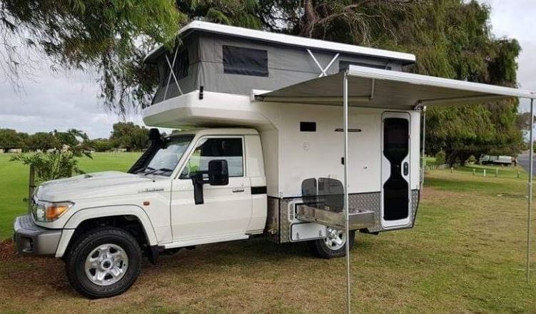 Features: Toyota Landcruiser, 4500cc V8 diesel, manual transmission, airco in drivers cab, radio with bluetooth, AUX and USB, 130 litres fuel tank, fuel consumption 12 litres per 100 km, 2 seats with seatbelts, 4 seat dinette, 2 sleeping places, shower cubicle, 12V/240V power supply, dual battery, 200W roof mounted solar panel, slide-out for generator (available for surcharge), UHF radio, snorkel, bull bar, manual awning with LED lighting, rear view camera, recovery kit with 12V air compressor and rear (20 litres) jerrycan holder. It is the only 4WD camper that offers the option of indoor and outdoor cooking. Model from 2018. Please note: a bike rack cannot be attached to the motorhome. This is the most spacious 4WD camper on the Perth-Broome-Darwin v.v. route.