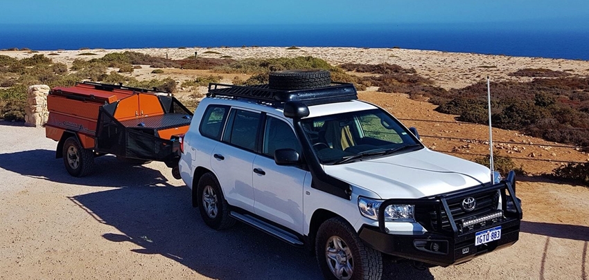 Features 4WD car: Toyota Prado 3000cc diesel, automatic transmission, airco, radio with USB, GPS navigation, 138 litres fuel tank, fuel consumption 12 litres per 100 km, 5 seats with seat belts, 3 anchor points for child or booster seats, UHF radio, bullbar, snorkel, large roof rack, two spare tyres, 12V air compressor, electric brake controller and 40 litres fridge.
