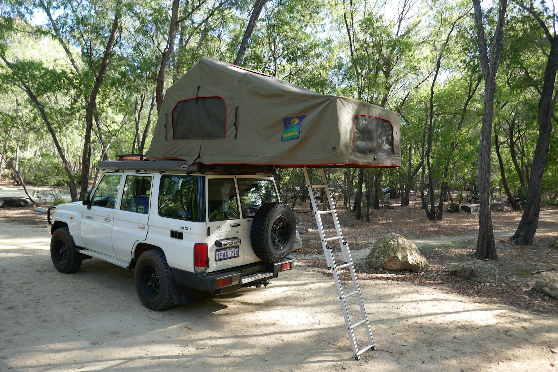 Features: Toyota Landcruiser, 4500 cc V8 diesel, manual transmission, 170 litres fuel tank, fuel consumption 12-13 litres per 100 km*, 5 seats with seatbelts, 2 sleeping places in rooftent, radio with AUX and USB, airco, fridge, 40 litres water tank and fill hose, roof rack, snorkel, bullbar, drawers for storage, dual battery, manual side awning, tow ball, recovery kit, UHF radio and Western Australia Parks Pass. The bed is by far the largest of all roof tents: L 220 cm x W 160 cm. Model from 2008-2009. The Landcruiser is one of the few 4WD campers allowed on the remote Canning Stock Route. Please keep in mind that this model is therefore booked up early for the dry season (May to September). Low season prices from AUD250.00 per day.