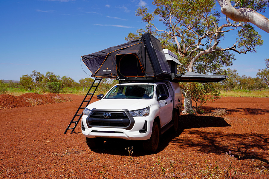 Features: Toyota Hilux, 2800cc diesel, automatic transmission, airco in drivers cab, radio with AUX and USB, UHF radio, 140 litres fuel tank, fuel consumption 12-13 litres per 100 km*, 5 seats with seatbelts, 4 sleeping places, electric rear tent, snorkel, dual battery, recovery kit with 12V air compressor, power supply 12V/240V, roof mounted solar panels and large awning. Setup time front tent 4 minutes, electric rear tent 30 seconds. Possibility for a child seat and/or booster seat. A portable toilet can be included for a surcharge. Model from 2022 or 2023. Low season prices from AUD280.00 per day. The 4WD is equipped with 240W of solar + 200AH Lithium battery. Your battery will charge thanks to the sun shine and while driving. Even with no sun and no driving, you have 12V power for around two days. Off to a stay in the bush!!